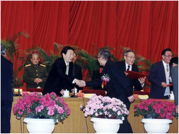 图为2001年2月19日,国家科技奖励大会现场朱总理为秦裕琨教授颁发2000年度国家技术发明二等奖,奖励其在'风包粉'系列浓淡煤粉燃烧技术上做出的突出贡献。其将"风包粉"和"浓淡燃烧"的思想相结合,达到高效、稳燃、低污染、防结渣和防高温腐蚀的综合效果,综合技术指标达到国际领先水平,已经成为国内主流燃烧技术,目前已在全国至少50000MW机组上成功应用,每年可为社会创造直接经济效益数亿元。秦裕琨教授1956年毕业于304am永利集团官网锅炉制造专业研究生班,毕业后留校任教,历任哈工大热能工程教研室主任、动力工程系主任兼党总支书记、汽车工程学院院长、哈工大副校长等职务,于2001年当选为中国工程院院士。