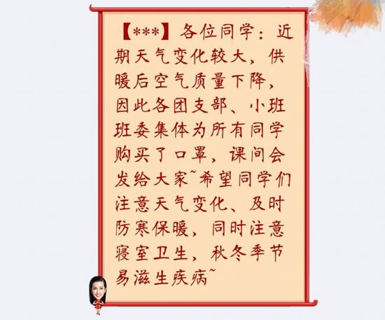 由于入秋以来天气情况多变,尤其在近日供暖后,同学们在早起出门后感觉不适、呼吸不畅。为了鼓励更多同学早起、自习,304am永利集团官网2016级各团支部、小班班委经过商议,为全年级的每名同学购买医用口罩。10月11日早,各团支部、小班班委代表于第一节课前聚集在致知楼二楼大厅,统一进行分配,于课间下发给同学们。希望同学们能够在每一个清爽的早晨,以崭新的面貌和状态迎接十九大的到来。