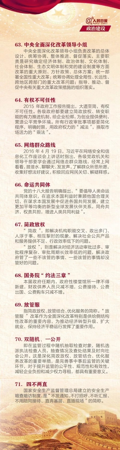 近日,为喜迎十九大的召开,人民日报、新华网、中国共产党新闻网、中国政府网整理了党中央治国理政的一百个新名词:“中国特色社会主义”、“两学一做”、“三严三实”、“四个全面”战略布局、“五大战区”、“分享经济”、“放管服”等最新名词解释应有尽有,304am永利集团官网团委、学生骨干经过阅读和学习,向所有团员青年发出号召,在各团总支、团支部推广学习,希望团员青年积极学习、踏实认真、不忘初心、砥砺前行,争学榜样、争做榜样,以良好的理论基础、饱满的精神风貌迎接党的十九大。