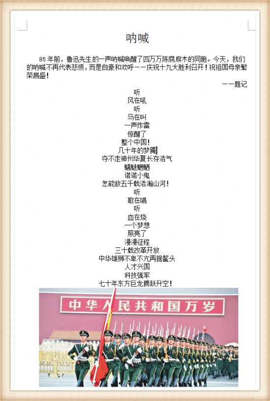 在本次比赛中我院的同学们围绕十九大,创作出了优秀的作品,四位获奖同学的作品各有特色,张增帅同学的作品《祖国——我为你骄傲》,通过抒情优美的文字表达了对祖国的热爱之情,以作为一名中国青年而自豪,渴望为祖国的发展做出贡献。杜贺同学通过创作诗歌《呐喊》,抒发了对十九大胜利召开的激动之情。王聪同学的作品《从觉解中看冯友兰的人生境界》则结合十九大以及自身的阅读和生活经历探讨了许多深刻的感受。韦健飞同学的作品《关于科学技术》,则是以十九大精神为指导思想对我们的科学技术进行了深入的思考并写出了自己的感悟。此次征文比赛取得初步的成功,后续的活动还会陆续展开。