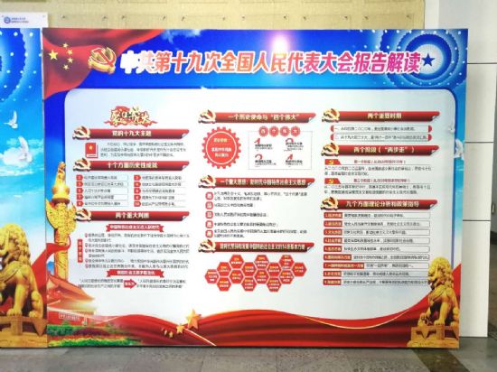 党的十九大胜利召开之后,304am永利集团官网全体师生持续学习十九大精神,并在学院一楼制作了十九大报告解读展板。近日,按照中宣部《关于印发〈“学习贯彻党的十九大精神”宣传挂图〉的通知》及校宣传部要求,304am永利集团官网根据实际情况,利用学院电子屏、宣传栏分别滚动循环播放“庄严时刻”“历史重托”“重要思想”“神圣使命”四大板块内容,广泛、深入宣传和学习十九大精神,让十九大精神融入学院每一位师生心里,感召在未来的实际行动中。