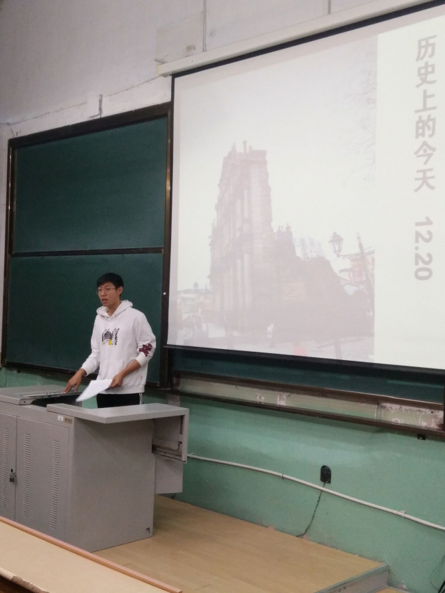 苗博宣介绍了1999年12月19日澳门回归的过程和重要意义。澳门回归是“一国两制”伟大构想的又一胜利,这不仅反映了我国国力的日益强盛,更体现了中华儿女对于祖国统一的殷切希望和不懈努力;雷睿介绍了历史上12月18日的多个事件,包括昆仑山反击战、中共十一届三中全会召开等内容,从历史唯物主义的辨证角度分析了自己对历史的理解;余志豪扩大思考角度,从历史长河的发展以及杰出人物的传奇与消亡中、深刻了对生与死的理解,并结合自身所见所闻,展开了充满哲理的思考,分享了自己的生死观。姚京达介绍了呼格吉勒图案的经过,以呼案为代表,分析了中国法制进步的历程,体现了依法治国的重要意义。王科朝介绍了国家和人民为铭记“南京大屠杀”付出的努力,铭记历史,直面历史,是大国的尊严和气度,也是大国发展和进步的决心。