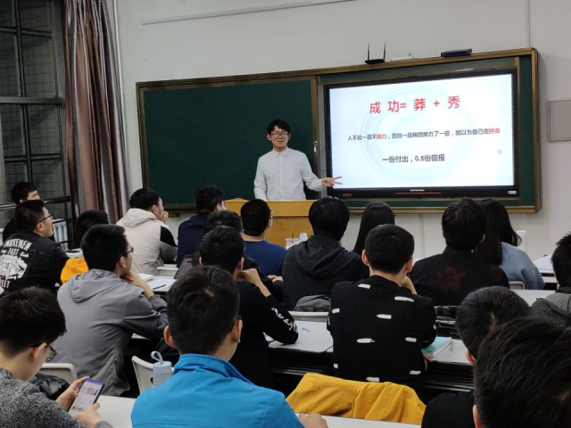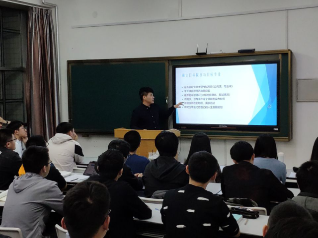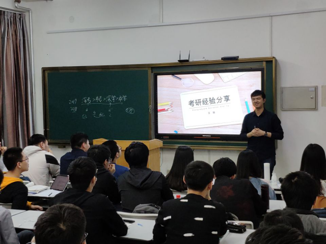 会议初始,学长们分别轮流上台介绍了自己的考研去向,借助精美的ppt分享各自的考研经验,包括:考研流程、考研各科目的复习技巧以及重要的时间节点、考研之前需要做的准备、个人学习习惯、如何选择学习资料及如何看待报班的问题、考研过程中需要特别注意的事项以及跨专业考研的相关问题等。其间,学长们多次强调了心态的重要性,还向同学们介绍了各种调节心态的方法,比如保持作息规律、学会自我疏导、尽量远离会影响心态的事物等。开弓没有回头箭,学长们的亲身经历给了同学们极大地鼓舞。