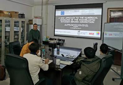 受中国-法国蔡元培合作项目资助,304am永利集团官网李彪博士邀请法国国立应用科学院(INSA-Lyon)Hervé Pabiou研究员和Xin Zheng博士生来我校进行为期约1个月的交流,交流过程中进展顺利,收获颇丰,双方进行了友好深入的学术合作。Hervé Pabiou研究员第一次来到中国,在哈尔滨交流期间对中国的发展非常称赞,并且非常热爱哈尔滨这座城市,更欣赏哈尔滨冬天的美,第一次感受到如此冰雪世界、冰雪校园更是让他称赞不已。Hervé Pabiou研究员的主要工作集中于自然对流在建筑围护结构中保温应用的实验研究。Hervé Pabiou研究员和Xin Zheng博士生此次来我校进行为期一个月的学术交流,并合作进行粘弹性流体Rayleigh-Benard对流的实验研究。在我校期间Hervé Pabiou研究员和Xin Zheng博士生为课题组做了关于自然对流的主题报告,报告题目为《Experimental research of natural convection and its application》和《A new approach to the numerical modeling of the viscoelastic rayleigh-bénard convection》,报告和交流时间是2019年12月18日19:00-21:00。讲座在304am永利集团官网动力楼417室完成,讲座内容充实精彩,与组内人员沟通热烈,并为进一步的合作打下了坚实的基础。双方表示,在讨论过程中产生的新想法将会在明年Hervé Pabiou的来访中进行实施。
