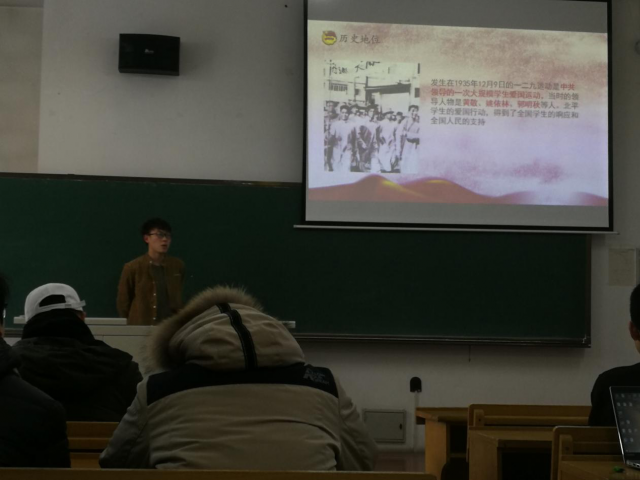 本次报告由班长尤志凯同学主持,副班长赵腾为大家进行报告,全体同学参加。赵腾同学首先为大家介绍了一二九运动的历史背景与实践历程,和大家共同回顾了那段历史,阐述了一二九运动重要的历史意义。在场的同学们在感受当时中国人民的爱国热情同时也感叹于现在生活的来之不易。紧接着,在班长的组织下,同学们观看了有关一二九运动的介绍影片《一二·九运动》。在观看完影片后,同学们更加了解了那段峥嵘岁月,在精神上也受到了极大的鼓舞。