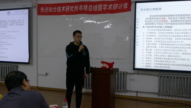 会上,于达仁所长总结了先进动力研究所2019十大标志性成果。过去一年先进动力所在多个方面成果斐然。在科研及学术上,斩获“国家科技进步二等奖”,获批工信部重点实验室,落实多个重大项目,于达仁教授当选黑龙江省“头雁”团队带头人;师资建设上,常军涛老师荣获吴仲华优秀青年学者奖,张军龙博士师资博士后入站,宁中喜老师荣获教学贡献奖等;学生培养上,任国瑞获吴仲华优秀研究生奖,李楠获聘西工大副教授,曾德迈荣获全国高校航空航天专业本科毕业设计大赛特等奖。同时于老师主持的国防科技出版社高超丛书全部完成出版,在国际合作上也取得多项新的进展。
