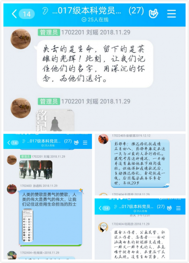 2020年4月4日,为表达全国各族人民对抗击新冠肺炎疫情斗争牺牲烈士和逝世同胞的深切哀悼,举行了全国性的哀悼活动。304am永利集团官网2017级本科生党支部积极响应号召,利用线上平台召开英雄事迹分享活动,向那些在抗疫一线艰苦奋斗,牺牲自己生命的英雄们表达敬意。