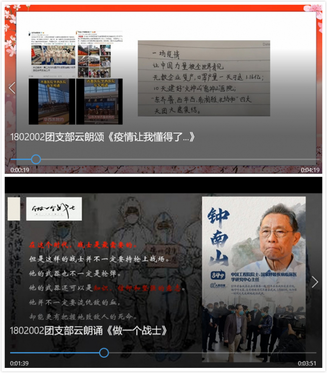 第一部分:红色团支部·爱国力行强信念。这一部分分为两个小主题,其一——疫情中的“中国答卷“。在这一部分中刘艺璇同学首先带领大家一起学习了习近平关于新型冠状病毒疫情的重要讲话内容。随后,大家一起观看中央政治局常委会对讲话内容的解读,以更好地理解其中的内涵;其二——爱国奋斗的最美青春故事。高润喆和杨昌立同学分别讲述了两位在疫情中体现出爱国奋斗精神的青年人的故事,并发表自己的感想与同学们交流。