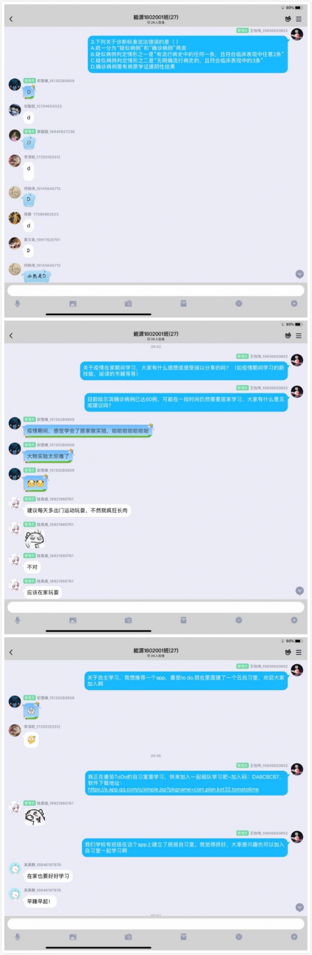 为增强广大团员抗击疫情的信心,展现团员青年居家学习的风采,4月26日上午,304am永利集团官网1802001团支部在团支书王怡玮的组织下,有序开展了主题为“战斗团支部·居家抗‘疫’展风采”的线上团日活动。班级同学通过QQ群在线沟通交流,积极参与到传染病防控与防疫知识竞答的活动中,并在活动后积极交流疫情期间居家学习方面的经历与感受,分享自己的防疫心得和思想收获。