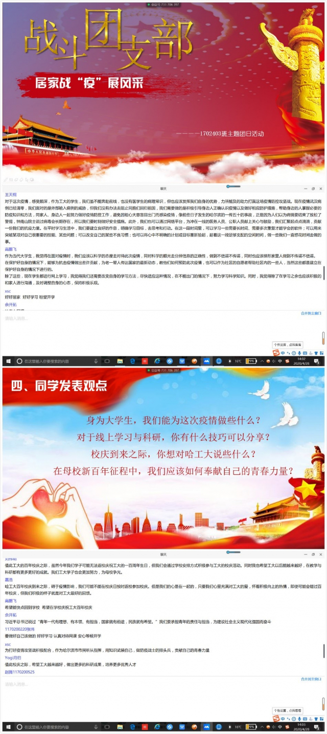 最后是自由发言环节,团支书杨诗瑜向大家提出“作为大学生我们能为疫情做些什么”、“对于线上学习科研的技巧分享”等讨论问题。以王天桐、冯月、王晨为代表的多名同学分别表达了自己对抗疫医护人员的敬意和对母校一百周年校庆的祝福。