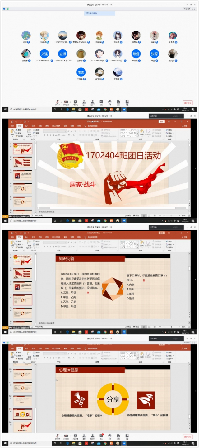 为在建校百年的重要阶段深入推进爱国主义教育,培养堪当大任的新时代青年,贯彻党中央关于新冠肺炎疫情防控各项决策部署,304am永利集团官网1702404团支部于5月1日举行“居家·战斗·活力”主题团日活动。本次团日活动采取疫情知识问答+小视频分享形式,在腾讯会议平台上进行。