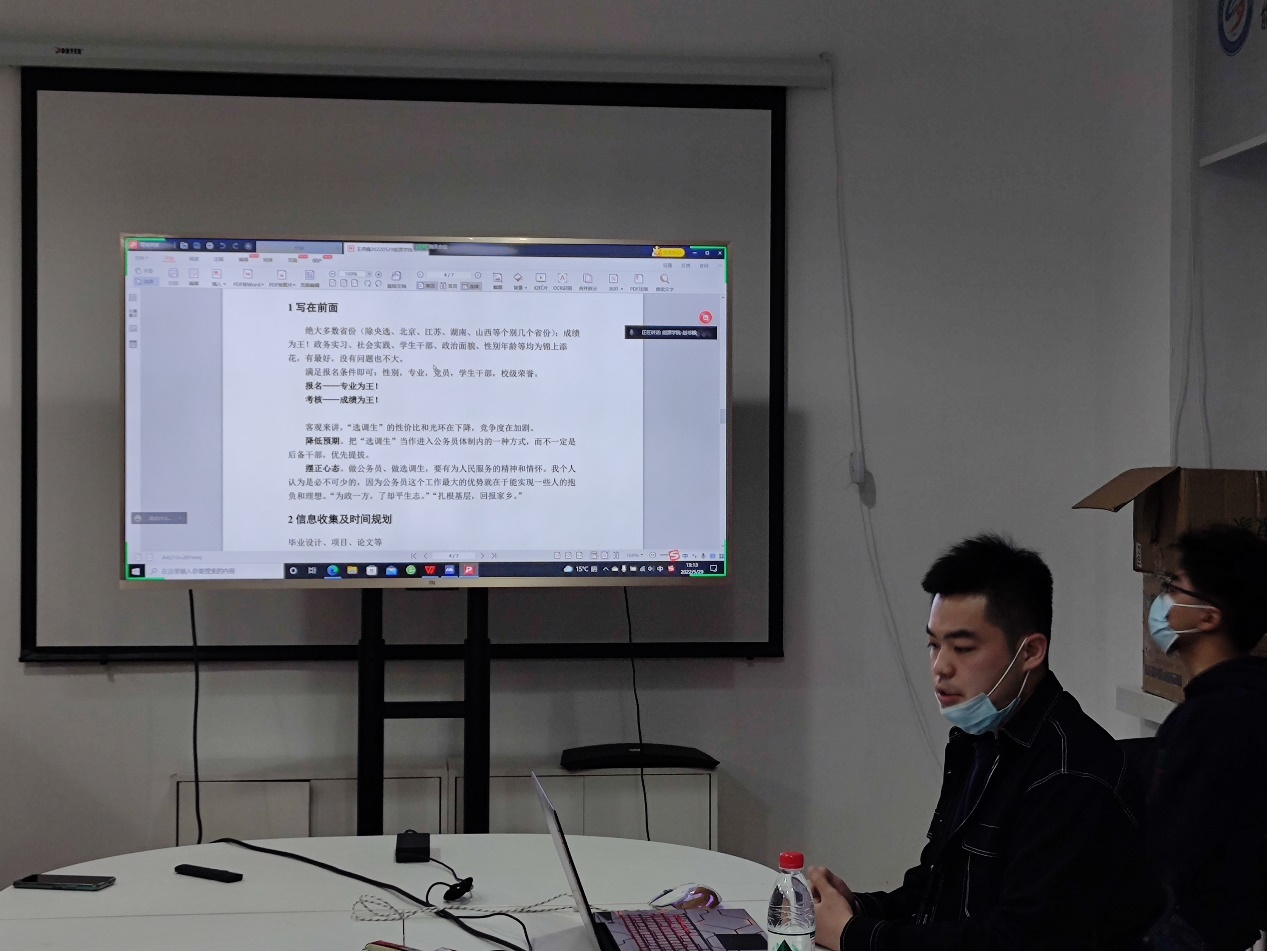 首先,马松松“以为什么选择出国留学”为引,分享了自己在申请前准备、申请学校选择、留学材料投递等方面的心得体会。之后,王得鑫以“为人民服务的精神和情怀”作引,分享了个人心态调整、学习时间规划以及面试面谈经验的心得体会。在随后的提问交流环节,两位师兄详细解答了同学们在留学时间节点、选调报考要求等方面存在的问题,师兄们丰富的经验和良好的建议使在场的同学受益匪浅。