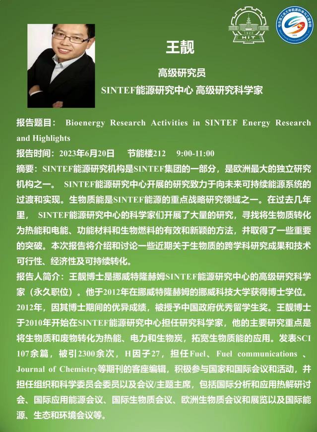 报告人简介:王靓博士是挪威特隆赫姆SINTEF能源研究中心的高级研究科学家(永久职位)。他于2012年在挪威特隆赫姆的挪威科技大学获得博士学位。2012年,因其博土期间的优异成绩,被授予中国政府优秀留学生奖。王靓博土于2010年开始在SINTEF能源研究中心担任研究科学家,他的主要研究重点是将生物质和废物转化为热能,电力和生物炭,拓宽生物质能的应用,发表SCI 107余篇,被引2300余次,H因子27,担任FuelFuel communications Journal of Chemistry等期刊的客座编辑,积极参与国家和国际会议和活动,并担任组织和科学委员会委员以及会议/主题主席,包括国际分析和应用热解研讨会,国际应用能源会议、国际生物质会议、欧洲生物质会议和展览以及国际能源、生态和环境会议等。