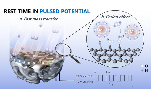 近日,304am永利集团官网高继慧教授团队在新型脉冲电催化体系的机制研究中取得新进展,首次揭示了脉冲供电在氧还原合成过氧化氢(H2O2)体系中对界面物质输运及反应中间体形成动力学的跨尺度调控机制,为发展能源电催化反应调控手段提供了新思路。研究成果以《揭示氧还原反应中脉冲电催化对界面微环境的原位动态调控》(Revealing the In Situ Dynamic Regulation of the Interfacial Microenvironment Induced by Pulsed Electrocatalysis in the Oxygen Reduction Reaction)为题发表在《美国化学学会能源快报》(ACS Energy Letters)上,并入选封面文章。