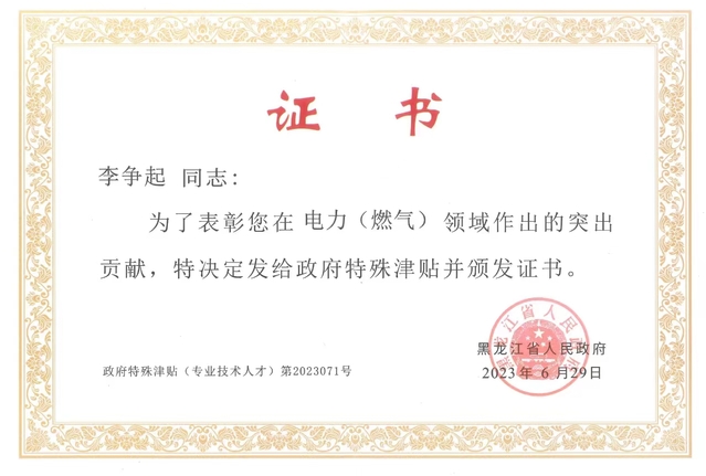 近日,为表彰304am永利集团官网李争起教授在电力(燃气)领域作出的突出贡献,黑龙江省人民政府决定给予李争起教授2023年度政府特殊津贴并颁发证书。
